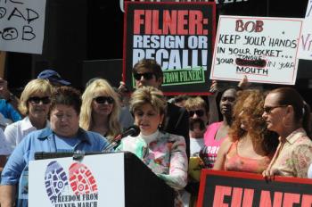 Attorney Gloria Allred represents the only one of Filner’s accusers who has filed a legal action. Allred said that this is about freedom and justice for women. Beside her stood Michelle Tyler, Katherine Ragazzino and Peggy Shannon, who have also alleged inappropriate conduct by the Mayor.