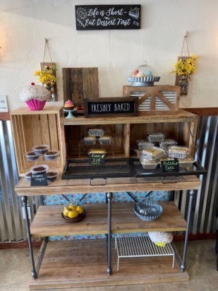 Photo, leftt by Henri Migala: sign above homemade dessert display reads “Life is short: Eat dessert first.”