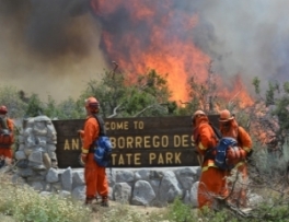 (Photo, left: 2012 fire that began at Ranchita swiftly spread to the Anza-Borrego Desert State Park; it merged with four other lightning-caused fires to burn over 22,000 acres, illustrating the importance of stopping fires early.)