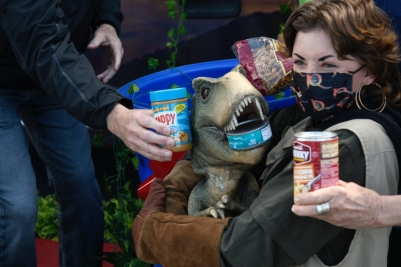 Del Mar Mayor Terry Gaasterland, San Diego Food Bank CEO James Floros, and Jurassic Quest Drive Thru dinosaur trainers were on hand to kick off the food drive on opening day.