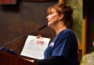 Photo right: Lorie Foss of Julian, who lost a home to wildfire, argued that both Cal Fire and the volunteer force are needed. Photo by Ken Stone