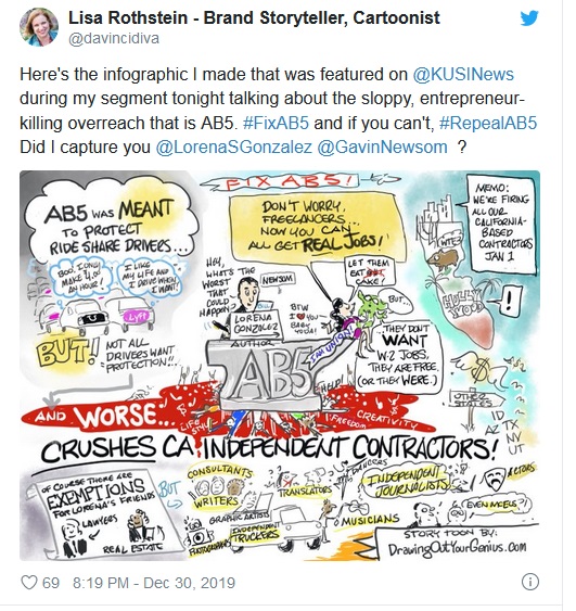 Lisa Rothstein, a freelance cartoonist who calls AB 5 “sloppy, entrepreneur killing overreach” fought back by creating a cartoon calling for AB 5 to be fixed or repealed – a cartoon that has been shown on KUSI TV and widely circulated on social media statewide.