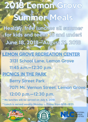 After receiving the Cities Combating Hunger through Afterschool and Summer Meal Programs (CHAMPS) Grant Award, Lemon Grove is working to promote the development and implementation of Afterschool and Summer Meal Programs in the City. The CHAMPS Grant Award is made possible through the generous support of the National League of Cities (NLC), The Food Research and Action Center (FRAC) and the Walmart Foundation.