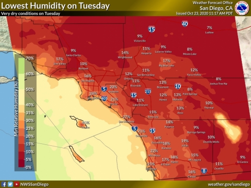 Tuesday is expected to be much drier with very low humidity and high fire danger. Moderate Santa Ana Winds are forecast to develop starting Monday, continuing Tuesday with north to northeast winds of 10-20 miles per hour and gusts up to 40 mph, blowing dust in desert areas.