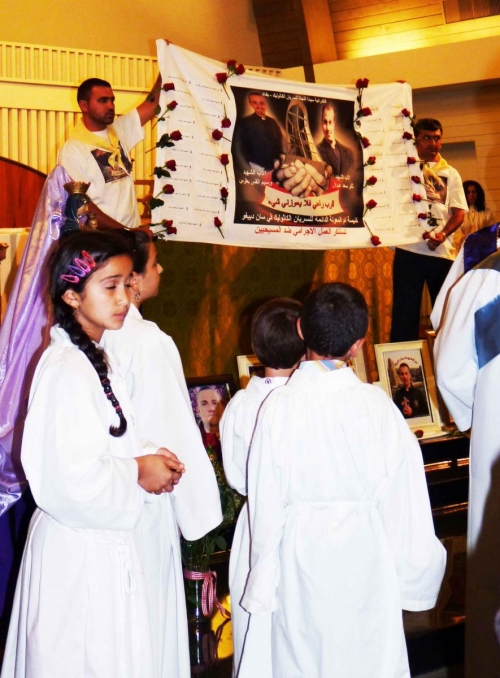 Draped across the altar a banner bore images of two slain priests: Fathers Thamir Abdal, 32, and Waseem Petrus, 27.
