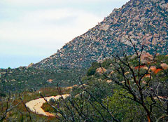 Further down the road, cracks in asphalt indicate concrete slabs breaking up beneath as we again venture south of 8. The landscape changes to boulder-strewn mountains , starkly beautiful. Craig pointed out a cut he helped slice through a mountain pass, then points to a cliff. “They were going to tunnel through that, but it was too expensive, so they said, `Just go through it.’” So they blasted and sliced a pass for the roadway.