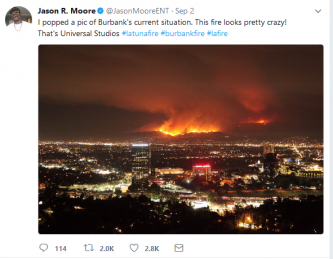 Photo, right: La Tuna Fire burning in Burbank behind Universal Studios, screenshot from Jason Moore’s Twitter feed