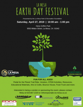 March 20, 2019 (La Mesa) – A Pedal for the Planet Trail Ride, arts and crafts, vendors, STEM activities, educational materials, a bounce house and food trucks are all part of La Mesa’s Earth Day Festival.