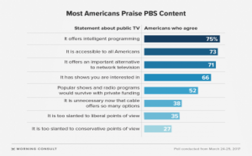 April 1, 2017 (Washington D.C.) – A new study finds that 54% of Americans surveyed oppose cuts to the Corporation for Public Broadcasting, which funds Public Broadcasting Service ie. public television. The poll conducted March 24-25 by Morning Consult among a national sample of 2,201 U.S. adults found that only 31% support cuts.