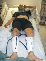 Caption: 8/30/09 - Resting in rehabilitation room 151A with sequential compression devices, or sequentials, to prevent Deep Vein Thrombosis (DVT).
