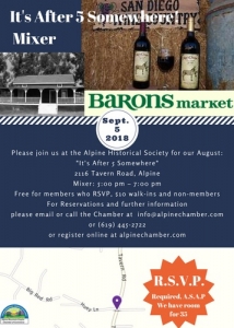 August 29, 2018 (Alpine) — The Alpine Chamber of Commerce invites you to come celebrate Alpine’s history at the Alpine Historical Society’s Museum (2116 Tavern Road in Alpine) on September 5th at 5:30 p.m. Baron’s Market will provide hors-d’oeuvres and Rock Canyon Vineyards will provide wine tasting.