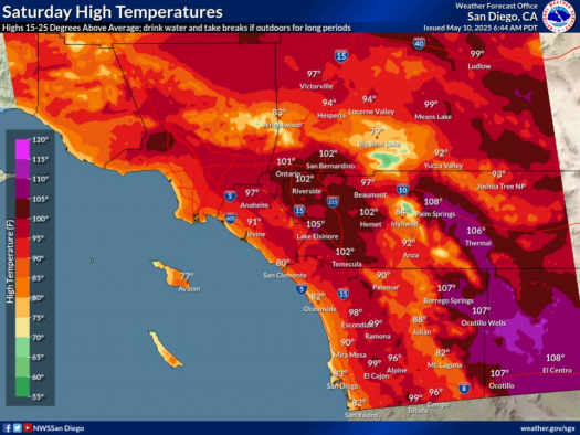 Temperatures could reach up to 114 degrees by this weekend in the low deserts and up to 105 degrees in the high deserts.   San Diego County valleys and mountains could reach 98 degrees.  The high heat poses risks of heat-related illness for people, pets and livestock without effective cooling and/or adequate hydration.