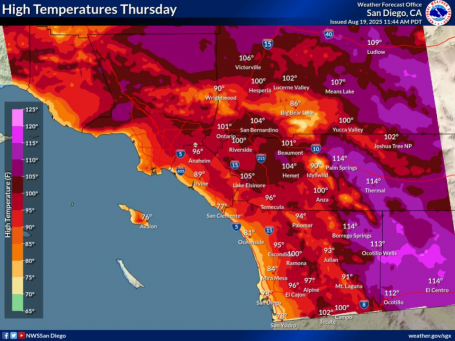 August 6, 2025 (San Diego’s East County) – Dangerously high temperatures are forecast across much of East County through Friday, peaking on Thursday. Other East County communities could reach the high 90s.