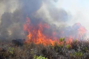 Update: The fire is now out but the roadway remains flooded and there are many other hazards. Lightning strikes are reported in the Warner Springs area and other locations including the bolt shown at left, taken by Bob Kutscher. This strike apparently ignited the fire, with smoke visible on a second image moments later shot from Borrego.