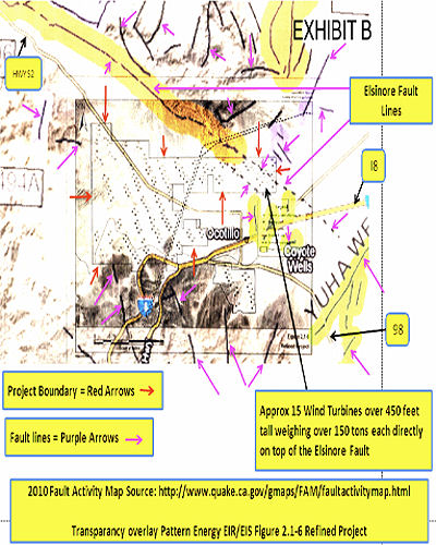 In addition, the appeal raised serious questions over seismic safety. The group’s lawyer, Lisa Belenky, said, “All the assurances about the location of the project in relation to the Elsinore fault are substantially inaccurate and potential impacts discussions need to be altered accordingly. See FEIS Figure 2.1-6. The FEIR at §4.11-40 states that the `applicant shall not locate project facilities on or immediately adjacent to a fault trace.’ As shown in Exhibits A and B, many of the project wind turbines are located near or on faults.”