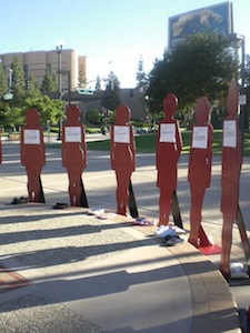 Silhouette statue images in the park were covered with descriptions of just a few of the sad stories of these fatalities. They stood mutely, while in front of them people stopped marching and shouted, “What do we want? Justice! When do we want it? Now!”