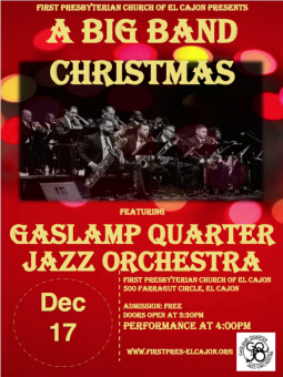 November 29, 2017 (El Cajon) – The Gaslamp Quarter Jazz Orchestra will present a free concert on Sunday, December 17 at 4 p.m. at the First Presbyterian Church, 500 Farragut Circle in El Cajon. The program includes a medley of Christmas music.  Doors open at 3:30 p.m.