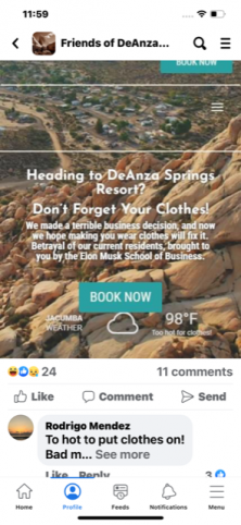 When the resort finally did post a notice on his homepage reading “Heading to De Anza Resort? Don’t forget your clothes!” someone created a parody meme on social media with the added phrase, “We made a terrible business decision, and now we hope making you wear clothes will fix it. Betrayal of our current residents, brought to you by the Elon Musk school of business.”