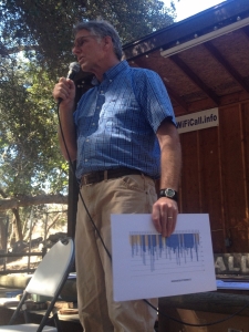 Pete Harper, who organized the event and works in escrow, gave the welcome. “About five months ago, I bought a place out here,” he said, adding that he liked the beauty of nature in Jamul. Then he found out about oak boring beetles killing oak trees. Harper discovered that his neighbors have tried different things without success. He did some research and invited two experts who have been working on this issue. Dr. Tom Scott is a natural resource specialist with the Department of Environmental Science at the University of California Berkley. Bret Hutchinson is the owner and operator of Green Tree Forest Services and a certified arborist at U.C. Riverside. Scott has dealt with oak tree mortality for the past 13 years. (Cheyenne Borello, a forester at the main Cal Fire Headquarters, was unable to come.)