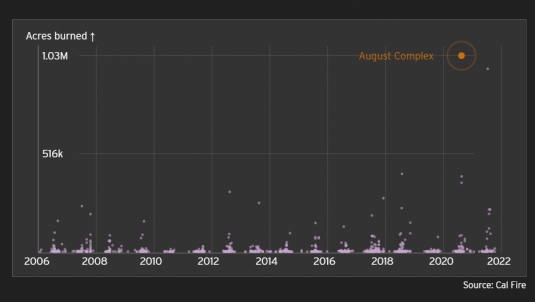Photo, left: in August 2020, lightning struck California more than 12,000 times during a tropical storm, which created more than 500 fires. 37 of those combined to become the August Complex, the third fire we are examining.