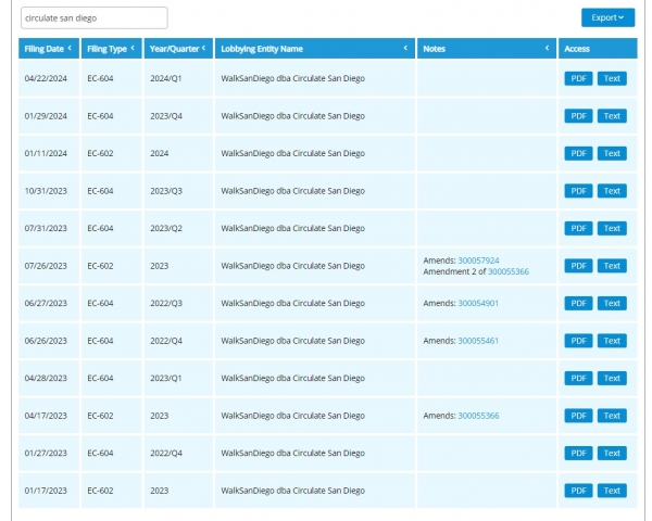 Circulate San Diego’s lobbying has continued too. The City of San Diego lists 12 instances of lobbying for Circulate San Diego between January 1, 2023 through April 22, 2024.