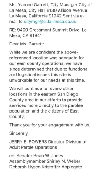 Today, City Manager Yvonne Garrett received a message from Jerry Powers, director of the state’s division of adult parole operations, advising that the agency has determined that “due to functional and logistical issues this site is unworkable for our needs at this time. We will continue to review other locations in the eastern San Diego County area in our efforts to provide services more directly to the parolee population and the citizens of East County.”