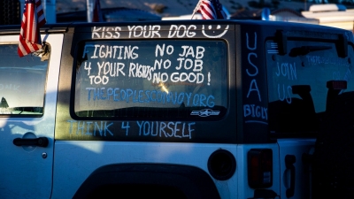 Some vehicles bore flags, including American and Canadian flags to show solidarity with truckers who staged a far larger protest over mandates in Canada.
