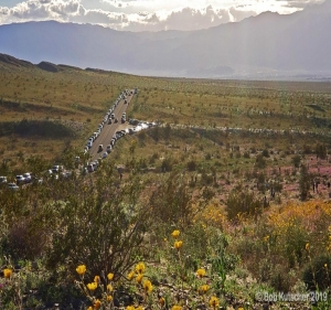 Bob Kutscher photographed a line of cars on Saturday, approximately 10 miles east of Borrego along S 22, a hot spot for flowers right now. Flower-loving visitors were parking and hiking into blossoming verbena fields, as vehicles kicked up clouds of dust on a nearby dirt road, West Truckhaven Trail.