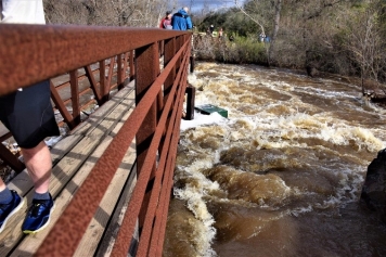 Photo, right, by Scott Lagace: San Diego River surges beneath footbridge in Mission Trails Regional Park.