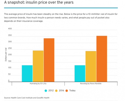 The stories of people who have to ration their insulin because they can’t afford their prescriptions are commonplace. Between 2012 and 2016, the price of insulin doubled, prompting higher out-of-pocket costs for diabetics, according to the Health Care Cost Institute. Today a 10-milliliter vial of insulin can go for anywhere from $170 to $400, depending on the type and brand. A person usually needs two to three vials a month, and some may need more.