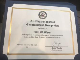 Mal Al Sham offers breakfast, lunch and dinner via dine-in and takeout, and can be found at Chamber of Commerce food events and local festivals like the Taste of El Cajon. The restaurant recently received a Congressional recognition certificate from Rep. Sara Jacobs for contributions to the community.