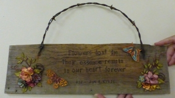 A makeshift memorial, with flowers and cards, now adorns a gate at the blackened site. At this meeting, one resident brought a hand-made wooden sign with a barbed wire hanger. It reads, Flowers don't die. Their essence remains in our hearts forever."
