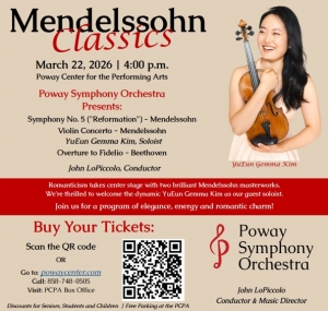 East County News ServiceFeb. 26, 2026 (Poway) -- The Poway Symphony Orchestra will perform a "Mendelssohn Classics" concert that starts at 4 p.m., Sunday, March 22, at the Poway Center for the Performing Arts.