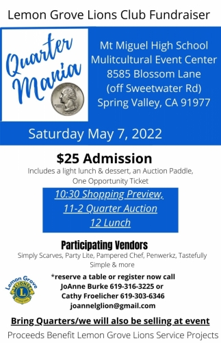 September 3, 2019 (Spring Valley) – Mt. Miguel High School Foundation will present “QUARTERMANIA” on Saturday, Oct. 5 from 10:30 a.m. to 2 p.m. at the Mt. Miguel High School Multicultural Event Center (8568 Blossom Lane, Spring Valley).