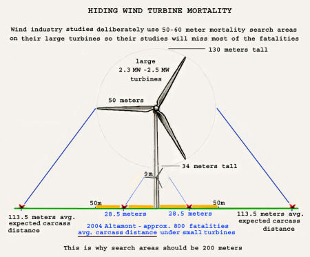 To fully grasp the wind turbine mortality problem one needs to refer back at a report from the Altamont Pass Wind Resource Area (APWRA) that was published in 2004. The study (Developing Methods To Reduce Bird Mortality In The Altamont Pass Wind Resource Area) lasted for 5 years 1998-2003 and despite wind industry interference, was actually a very fine effort. Even so it did have some flaws. One of the primary flaws was that search intervals when looking for fatalities around turbines, were much too far apart. At 30 days or more searchers were missing a high percentage of the carcasses to scavengers. Smaller bird species and bats were especially absent from the lists compiled from mortality searches around turbines. This study tried to compensate for the unknown number of causalities with statistical adjustments taken from scavenger studies, searcher efficiency, and other factors for carcasses removal. The report even suggested that there were errors (on the low side) in mortality estimates due to human causes.
