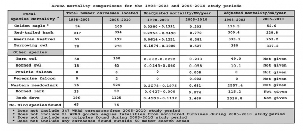 This study also documented that food sources for raptors, turbine sizes, and turbine placement had a direct bearing on raptor mortality. As a result many of the most dangerous turbines or groups of turbines, with a history of killing golden eagles, kestrels, burrowing owls, and red-tailed hawks were indentified.