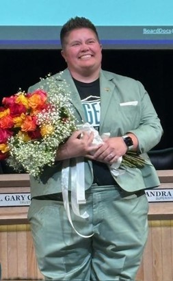 The previously awarded teacher of the year Kristin LoPrell, returned to the dais, where she gave back a bouquet of flowers celebrating her achievement, to voice her dissent.