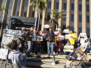By Nadin AbbottDecember 7, 2011 (San Diego)--The Occupy Foreclosures National Day of Action took place at the Civic Center Plaza yesterday afternoon. The event was led by David Blankstein from Alliance of California for Community Empowerment (ACCE) http://www.calorganize.org/, as well as Occupy San Diego and “Women Occupy of San Diego.” According to Mr. Blankstein “millions have lost their homes, and two million homes are underwater in the state of California.” He also said that ACCE was inspired by the Occupy movement to take action.
