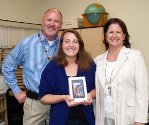 Santana High School Social Science teacher Rebecca Short got a big surprise recently as Santana Principal Tim Schwuchow notified her in front of her students that her winning technology proposal was selected by the District’s Ed Tech Taskforce.. Short’s students will soon get more mileage out of accessing the information highway thanks to a generous gift of 25 Samsung Galaxy Tabs™ 7” from the Jimmie Johnson Foundation and Samsung.
