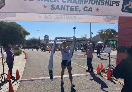 January 13, 2025 (Santee) -- Under sun drenched skies, some of the best race walkers in the world shattered several records as they traversed the Santee Trolley Square course on Jan. 12.
