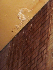 The most serious issue in need of repair is a leaking metal roof with corrosion along standing seams. The leakage is visible along the side lobby areas, though not over the seating area. The roof is flat in the center with a mansard roof that slopes downward on the sides.