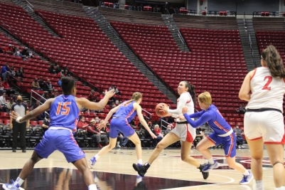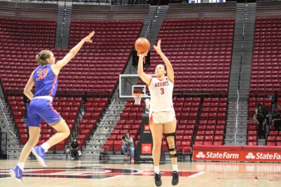 The Aztecs never took their feet off the brakes in the second, even when they had to compete with the three-pointer skills of Boise State senior forward Rachel Bowers. The red and black coasted through the quarter and went to the locker room with an eight point lead, 40-32, at the half.
