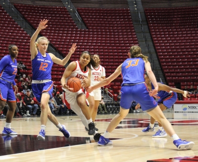 It may have been Broncos sophomore guard Abby Muse who scored the first points of the game, but after that, Asia Avinger and Mallory Adams took over. The Aztecs redshirt freshman and the junior combined for 21 first quarter points and the Aztecs burst out of the gate shooting 75 percent from the field to take a 25-17 lead after one.