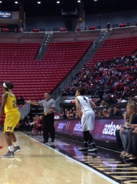 Unfortunately, even with a bigger crowd than is normal for women's basketball games, the Aztecs couldn't stop the game the 7-2 Wolverines brought to Montezuma Mesa. They were fast, tough and every shot seemed to fall, and, like Grand Canyon did to the men on Wednesday night, the Wolverines were killing the Aztecs with the three ball. The Aztecs, meanwhile, couldn't get any shots to fall and their only points came from free throws. But towards the end of the first quarter, a bit of the Aztecs’ game came back. They still ended the first down by 16, 29-13.