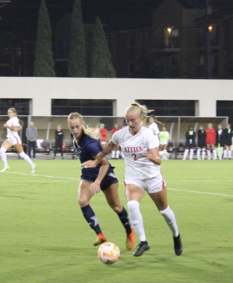 Although it was Senior Night, the sophomores stole the show. Two of them joined forces to get the Aztecs on the board first. After Emma Gaines-Ramos missed her attempt in the 16th minute, Carlin Blake fired it smoothly into the top left corner of the goal for her first goal of her college career and the Aztecs led 1-0 after 45 minutes.
