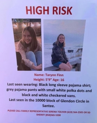 January 11, 2020 (Santee) – Members of the public are asked to join in a search today for Tarynn, a 16-year-old missing in Santee. The teen was last seen in the 10000 block of Glendon Circle in Santee yesterday.