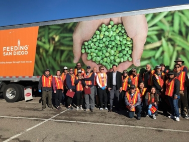 Photo: Senator Brian Jones loading food at the drive-thru distribution event and afterwards with Feeding San Diego volunteers (below right)
