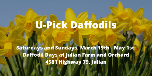 In addition, you can enjoy U-pick daffodils on Saturdays and Sundays from March 19 through May 1 during Daffodil Days at Julian Farm and Orchard, 4381 Highway 79, Julian.