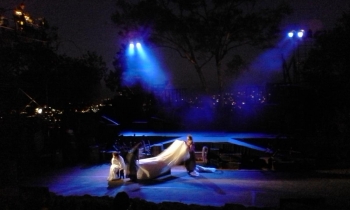 Later when the barricade is rolled off to stage right, viewers see the backdrop of some of East County’s mountains beyond the eucalyptus tree behind center stage. The view turns to twinkling lights as the rehearsal continues into the night. The experience of being atop Mount Helix cannot be overstated. Experiencing the 360 degree view as you arrive during daylight is breath-taking. Night softly falls and you notice stars appear as your eyes rise above the spectacle on stage.