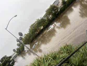January 22, 2024 (San Diego’s East County) – Heavy rains during today’s storm caused widespread flooding, road closures, power outages, and inundation of vehicles and structures including an East County school. Flooding also prompted numerous rescues including motorists trapped in vehicles in Spring Valley and Lemon Grove, as well as homeless people stranded by rising waters along the San Diego River in Santee.